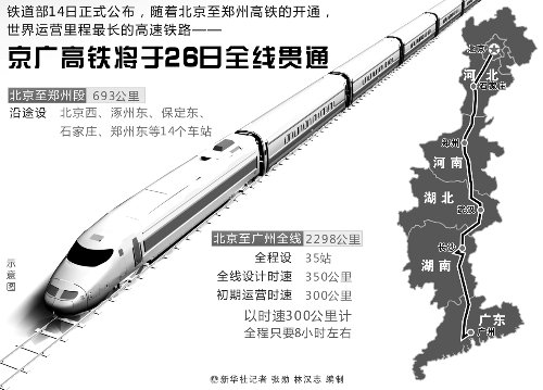 11天后,郑州到北京,两个半小时,高铁走起!京广高铁将于本月26日全线贯通的消息得到证实。昨天,铁道部发布消息称,京广高铁北京至郑州段已完成开通运营前的各项准备工作,26日正式开通运营。与郑州至武汉段、武汉至广州段连接后,京广高铁将成为世界上运营里程最长的高速铁路。届时,将开行155对动车组列车,最快一趟全程只需7小时59分,停靠站点就有咱郑州。